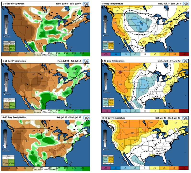 10-day forecast offers mostly widespread rainfall across the corn belt, although some pockets of the eastern corn belt may be left dry. Temperatures are likely to run below normal in the west and slightly above normal in the east over the next 5 days
