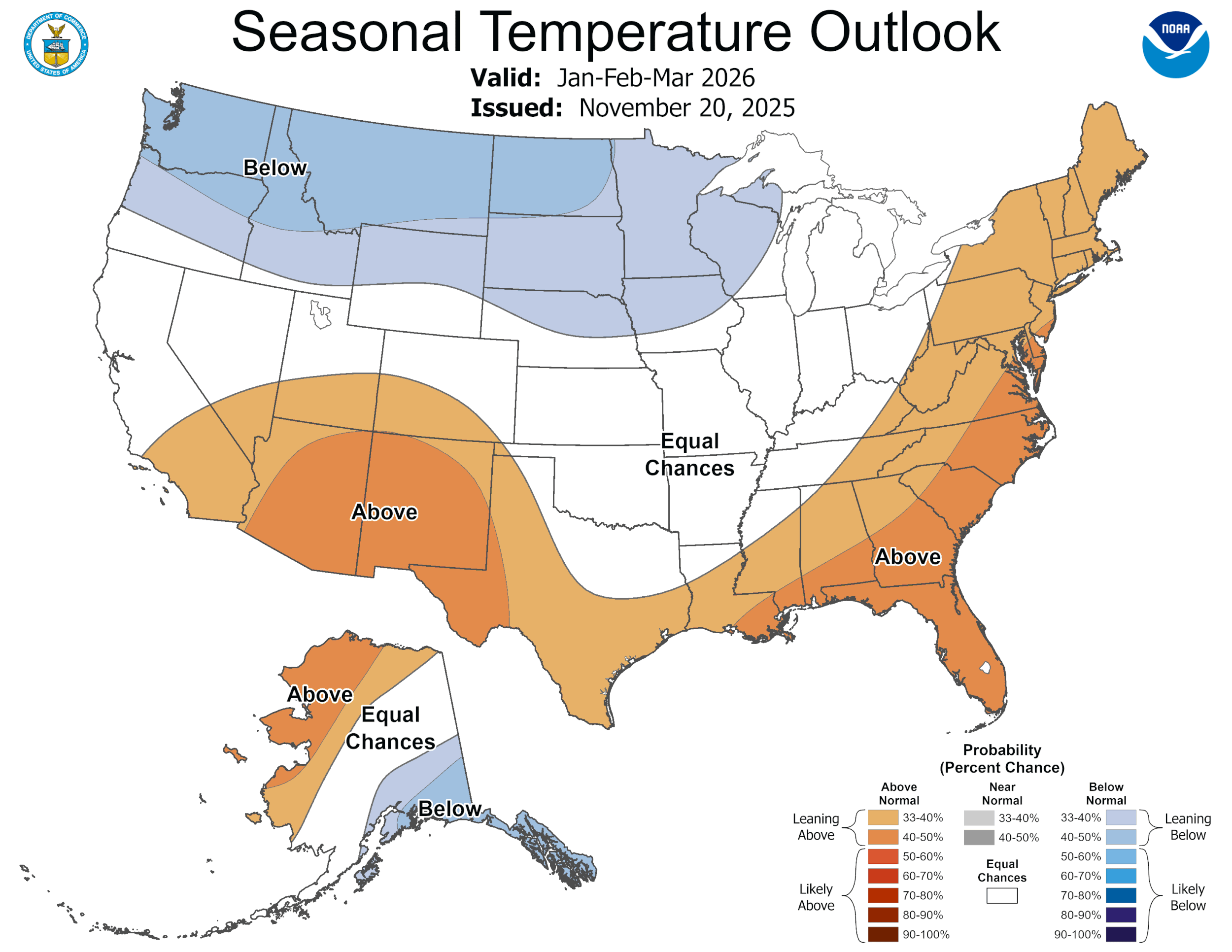 The Climate Prediction Center released that La Niña is favored to continue into the Northern Hemisphere winter, with a transition to El Niño-neutral most likely in January-March 2026 (61% chance).
