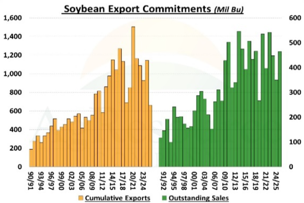 Soybean futures were lower post report but rallied Thursday following reports the Trump administration plans to finalize biofuels blending quotas by March, potentially setting the stage for higher production of biomass-based diesel. Higher blending targets could provide a much-needed demand boost to help offset lost export business. Looking at exports, as of Thursday, known soybean commitments to China and unknown destinations totaled 12.334 MMT. While not all unknown purchases were by China it appears safe to say China is very close to, if not completed with the 12 MMT of soybean purchases they agreed to via the late-October trade deal. It’s visible below that US cumulative sales pace has been slow without China.