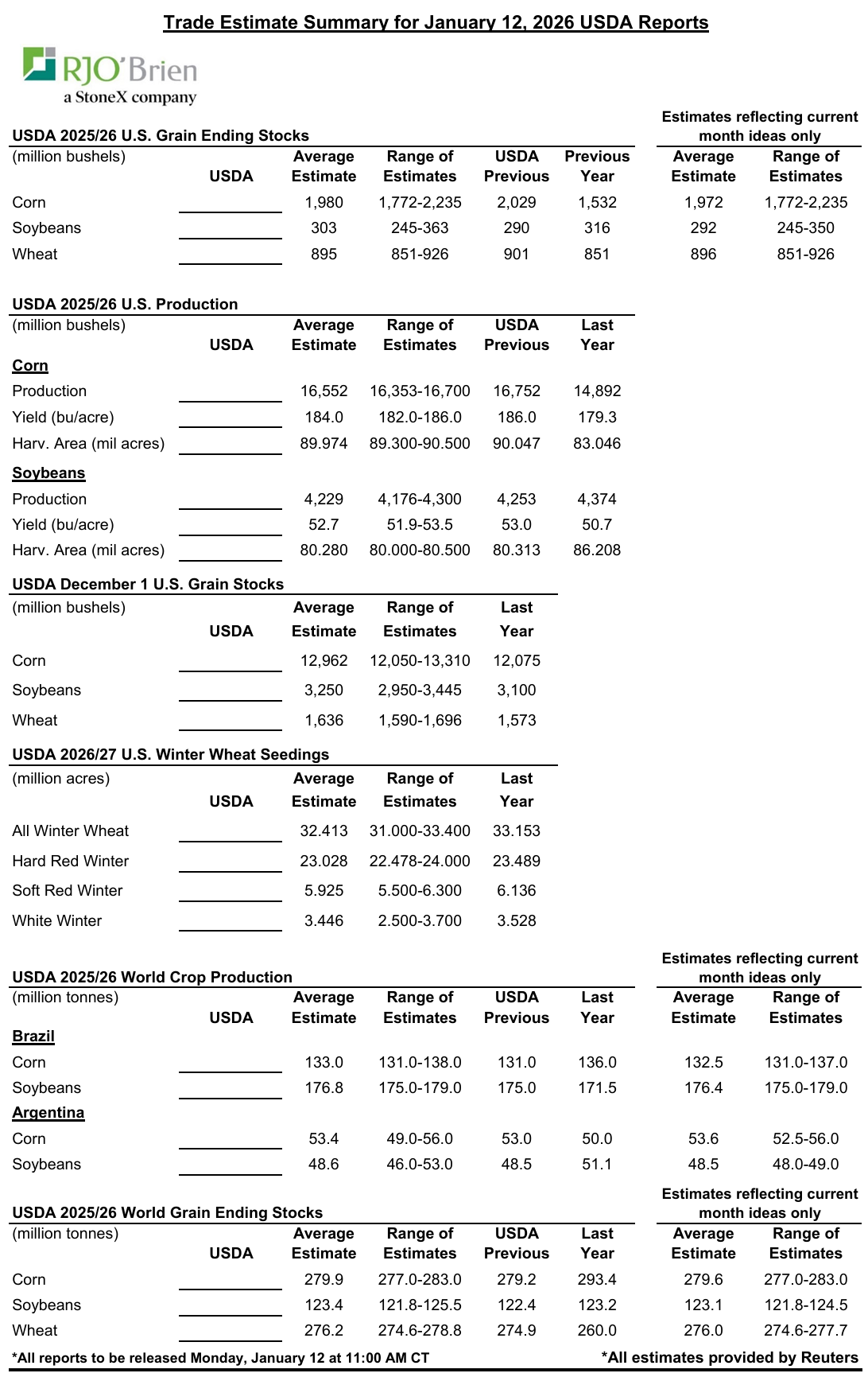 The January WASDE report releases on Monday, January 12th at 11:00 AM central time. The report combines several major reports at once, including Annual Crop Production, Grain Stocks, WASDE, and Winter Wheat Seedings. Because these reports can interact with one another, a surprise in one category can ripple across balance sheets and trigger market fluctuations. With delayed data now fully incorporated after the government shutdown, this will be the USDA’s first opportunity in months to meaningfully reassess supply and demand.